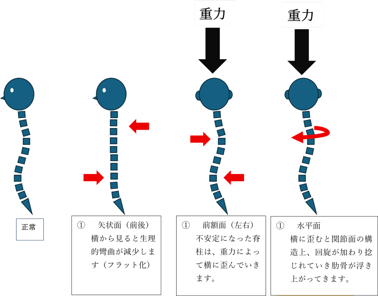 しかし、骨盤の左右高低差や背骨のフラット化などにより背骨の関節が緩くなった状態では、重力によって側方へ背骨はズレていき側弯が生じてきます。